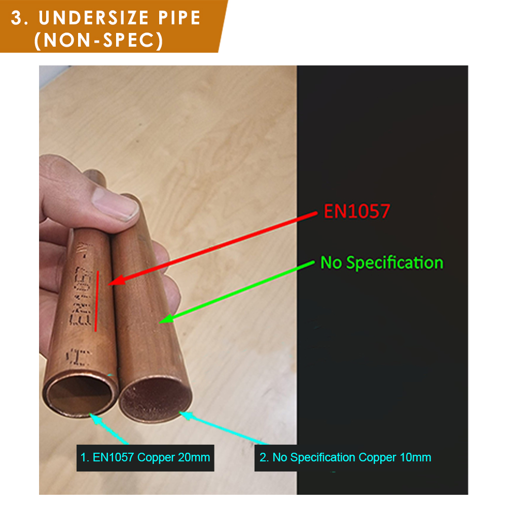 Refer to the photos: we can see that the non-specification copper pipe thickness is only 10mm, which is smaller than the BS EN 1057-compliant copper pipe of 20mm.