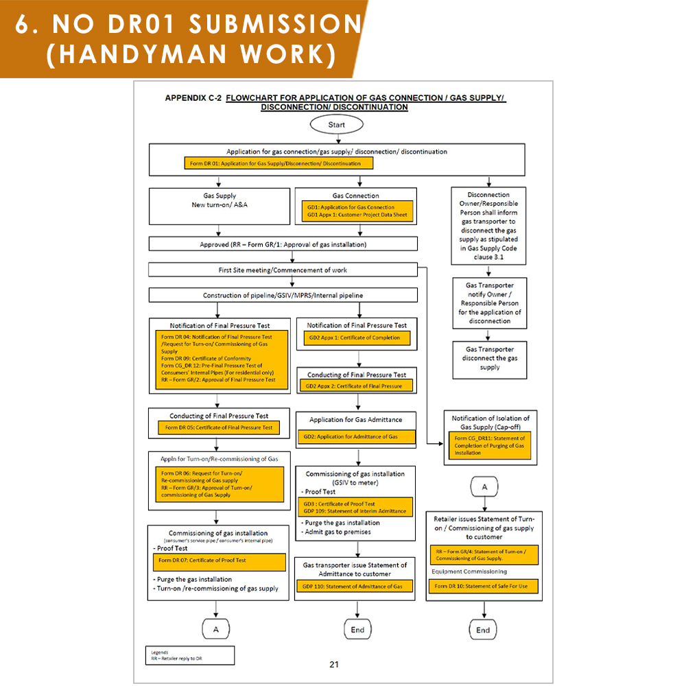This violates the City Energy Handbook on Gas Supply, which requires submission of Form DR01 to City Energy for approval before commencing any gas alteration or A&A work.